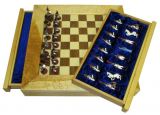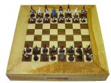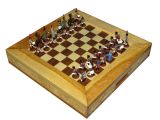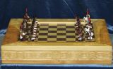 Этот эксклюзивный комплект - дань памяти русским воинам, положившим свои жизни на алтарь победы русского оружия над мощью наполеоновкой армады. Доска в данном наборе выполнена из массива черного горного дуба и украшена тематической резьбой по краю игрового поля. В правых углах игроков можно увидеть легко узнаваемые фигуры князя Кутузова и Наполеона Бонапарта, остальную площадь занимает изображения родов войск и вооружений каждой из сторон. Поле набрано из попеременно расположенных клеток темного (европейский орех) и светлого (американский клен) сортов шпона. Действующими лицами, - фигурами - выступают настоящие оловянные солдатики, отлитые и покрашенные вручную российскими мастерами. Фигурки убираются в выдвижные ящики (войска Наполеона в один, русские воины в другой). Для каждой фигуры предусмотрен отдельный мягкий ложемент. На противоположных боковых торцах доски по центру вырезаны вензеля глав противоборствующих государств, - Наполеона I и Александра I