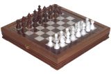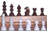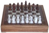 Это, пожалуй, самый увесистый набор шахматных фигур в нашем ассортименте. Его весомость складывается из увесистости мрамора, из которого выполнены фигуры и игровое поле, и тяжести драгоценного красного дерева, массив которой использован при изготовлении самой доски и оклада игрового поля. Фигуры в этом наборе выполнены из красного оникса и белого мрамора. При всем при этом в эти шахматы очень удобно играть. Характеристики этого набора полностью соответствуют запросам любителей этой древней игры: