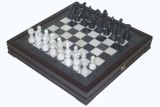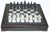 Это, пожалуй, самый увесистый набор шахматных фигур в нашем ассортименте. Его весомость складывается из увесистости мрамора, из которого выполнены фигуры и игровое поле, и тяжести экзотичного венге, массив которого использован при изготовлении самой доски и оклада игрового поля. Фигуры в этом наборе действительно "черные" и действительно "белые". Черные выполнены из черного мрамора, а белые, соответственно, из белого мрамора. При всем при этом в эти шахматы очень удобно играть. Характеристики этого набора полностью соответствуют запросам любителей этой древней игры: