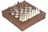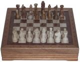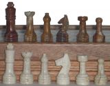 Это самый увесистый набор шахматных фигур в разряде компактных в нашем ассортименте. Его весомость складывается из увесистости камня, из которого выполнены фигуры и игровое поле, и тяжести драгоценного красного дерева, массив которого использован при изготовлении самой доски и оклада игрового поля. При всем при этом в эти шахматы очень удобно играть. Характеристики этого набора полностью соответствуют запросам любителей этой древней игры: