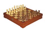 - Фигуры выточены вручную: светлые из самшита, а темные из розового дерева. Высота короля - 2,75 дюйма (около 7 см).
