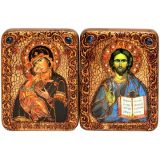 Венчальная пара инкрустированных подарочных икон «Владимирская икона Божией Матери» и «Господь Вседержитель» на мореном дубе (15*20 см, Россия) в подарочной коробке